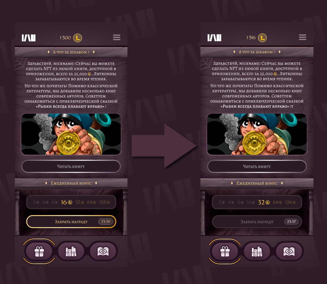 **За шкафом** - ежедневная награда с прогрессивной шкалой! Если вы не забываете забрать награду, то на следующий день она удваивается, и так вплоть до 128 литкоинов, после чего прогресс запускается заново. Если пропускаете какой-то день, то прогресс тоже запускается заново.